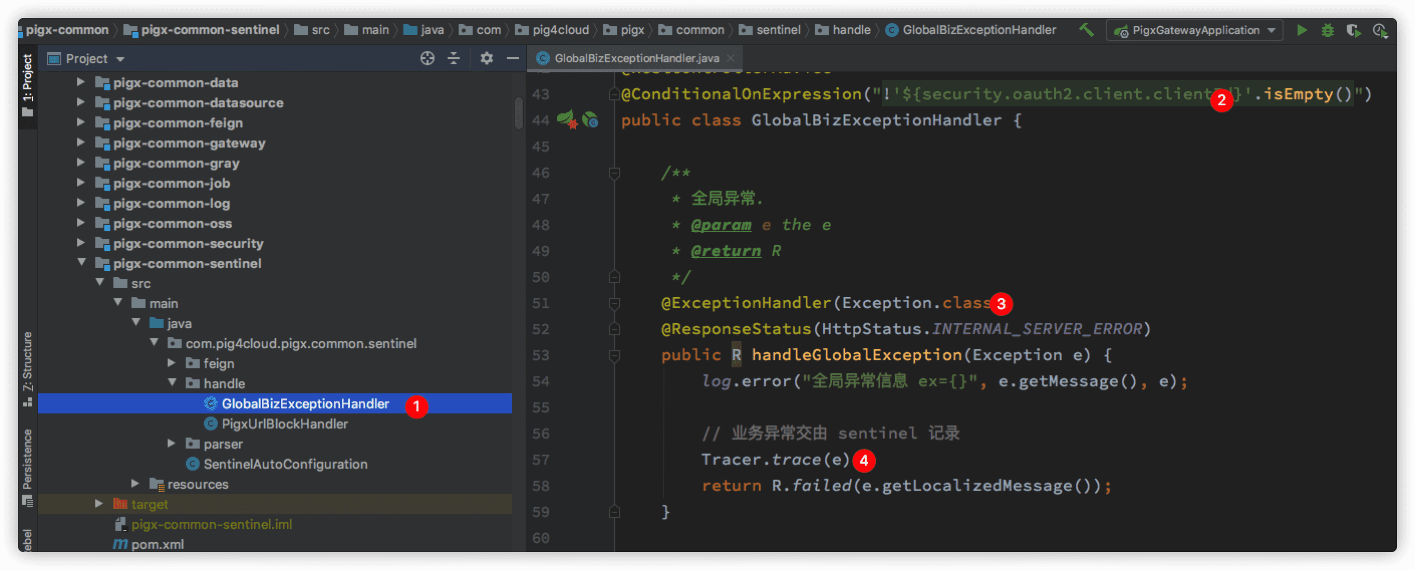 - ① pigx 提供的全局异常处理位于
